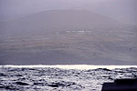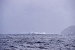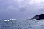Orkans waren immer noch zu spüren (Bild rechts). Plötzlich ein Aufschrei von Dirk: "EISBERGE !". Und tatsächlich, südlich der Einfahrt in die Bucht konnten wir zwei massive Eisberge erkennen. |