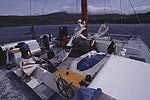 wiederhaben...". "Scheiße", dachte ich, naja... Der einzige Grund , warum wir noch einmal anlanden sollten war, dass wir noch unsere "Liegegebühr" und die "Personengebühr" für unseren Aufenthalt beim Leiter der Station abgeben mussten. Es ist selbst hier in dieser Gegend der Welt alles geregelt. Liegegebühr (bzw. Ankergebühr) 170 Euro, Personengebühr p.P. 5 Euro. Also wieder Beiboot klarmachen und los ging es per Paddel zum Strand. Dem Leiter hatten wir schon per Funk bescheid gegeben, dass er bitte zum Strand herunterkommen sollte wegen der Bezahlung. Beim Anlanden warf uns eine Welle fast um, aber als wir am Strand waren war auch schon der Leiter der Station vor Ort uns half uns mit Kräften. Karl-Heinz wickelte die Bezahlung ab und ich schnitt die Leine vom Festmacher. Durch den Zug war der Knoten bombenfest gezogen. Der Rest des Seil war total in den am Strand treibenden Kelp eingewickelt und so konnte ich sagenhafte 15 Meter Seil bergen. Der Commandant wünschte uns noch eine gute Fahrt und wir stiegen wieder ins Beiboot. Beim abstoßen vom Strand stand ich bis zur Hüfte im kalten Wasser. Zurück an Bord setzten wir eine kleine Fock und fuhren wieder in die Baie Americaine, um uns dort noch einen Tag zu erholen. |