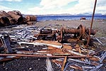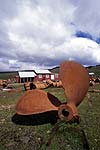 Lediglich ein kleiner Teil der gesamten Anlage wurde restauriert, um sie vor dem totalen Verfall zu bewahren und Wohnmöglichkeiten für Wissenschaftler zu erhalten, so z.B. die beiden Häuser (Bild links). Die alte Schiffsschraube wurde von den Walfängern zurückgelassen (Bild rechts). |