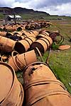 um die Gebäude herum liegen hunderte von verrrosteten Fässern,